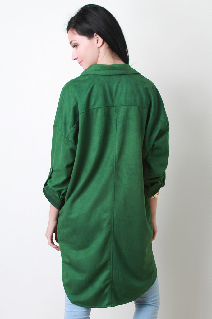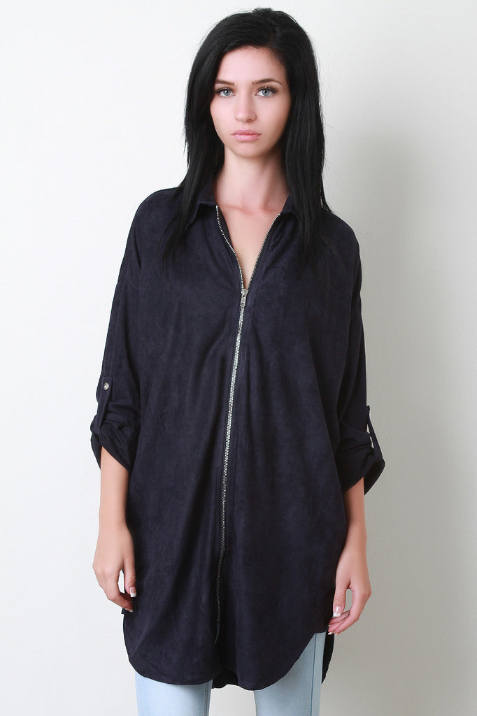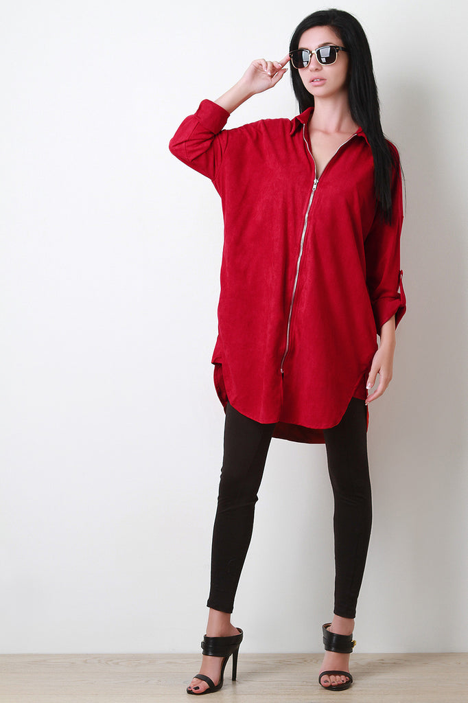 This oversized button-up shirt features a soft vegan suede, classic shirt collar, long sleeves with single button cuff closure, and full-length front zip up closure. Finished with side slits and rounded hemline. Accessories sold separately. Made in U.S.A. 95% Polyester, 5% Spandex.