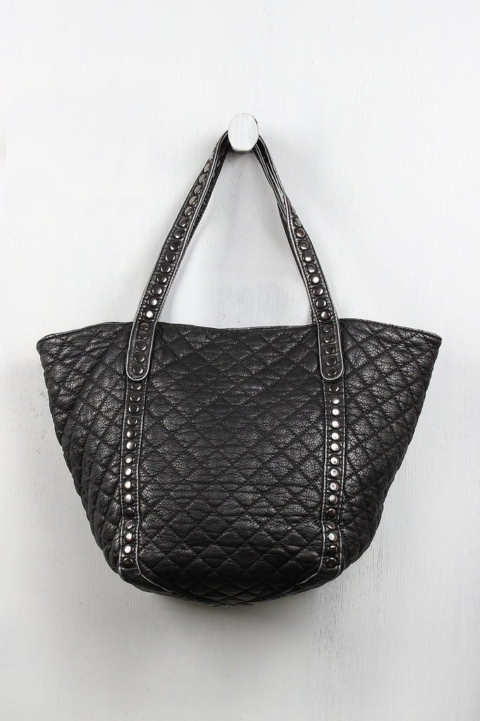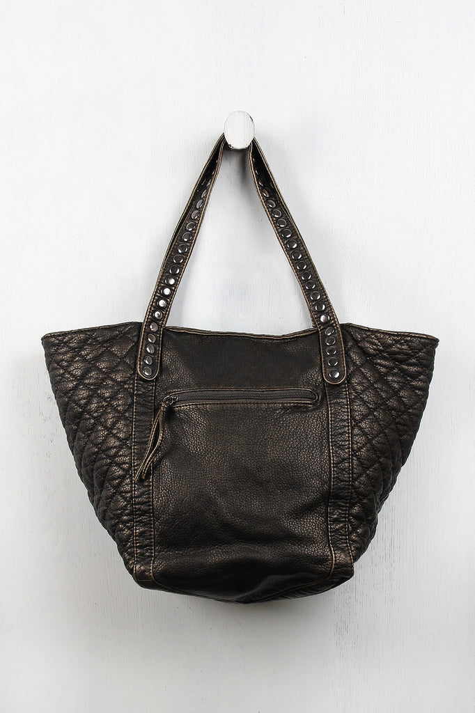 This metallic quilted bag features soft vegan leather, two flat handles (9" drop) with flat round stud embellishments that extend along the front of the bag, and a lined interior with two slip pockets and one zipper pocket. Finished with top zipper closure and an exterior zipper pocket at the back.