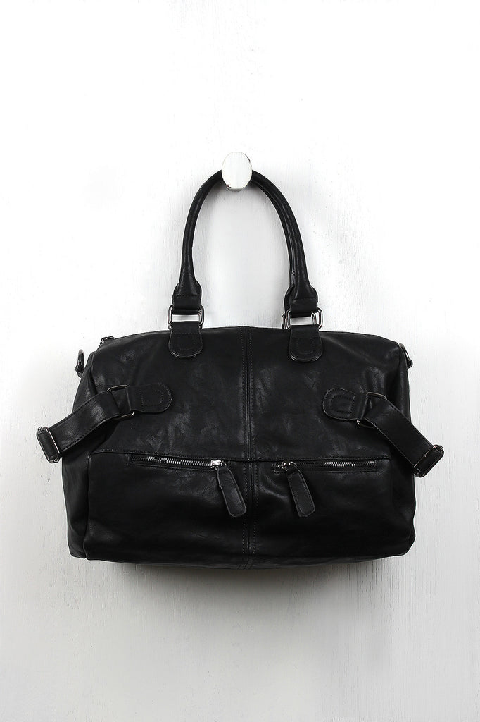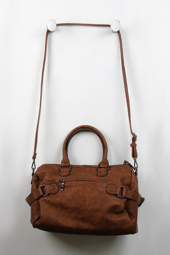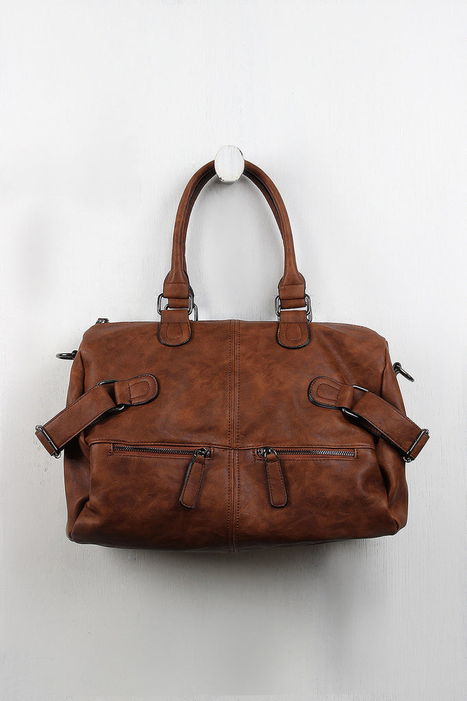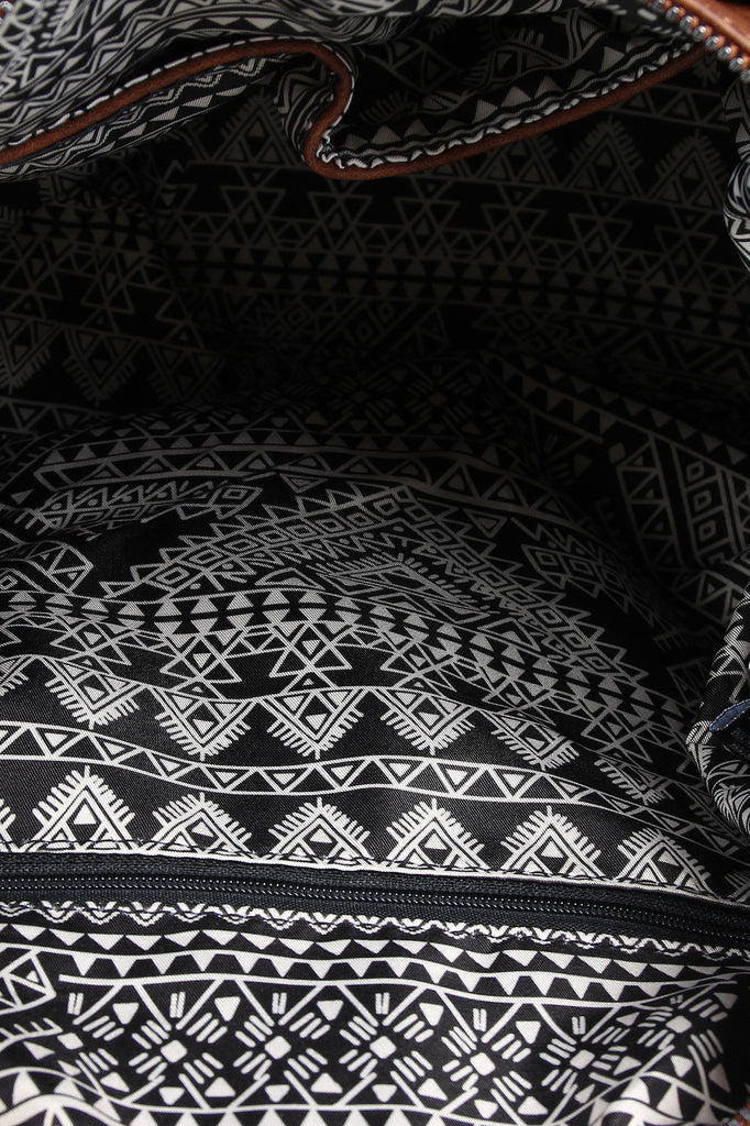 Description This vegan leather bag features two round handles (7" drop), a wide zipper top, and two zipper pockets at the front. Belts on either side of the bag allow you to cinch the bag tighter for a more streamlined look, and a zippered back pocket gives you a secure place to store your wallet that's also easily accessible. The spacious interior has a tribal pattern lining, two slip pockets, and one zipper pocket. Includes adjustable shoulder strap.