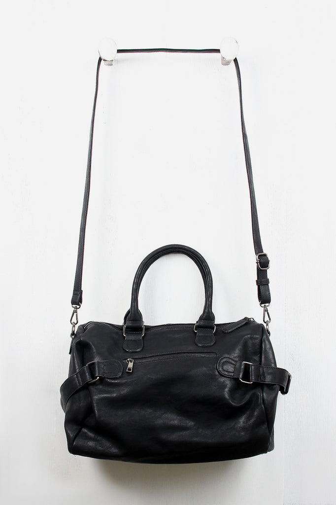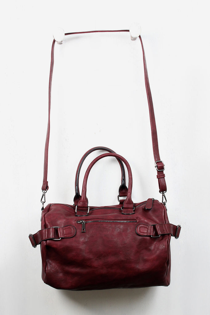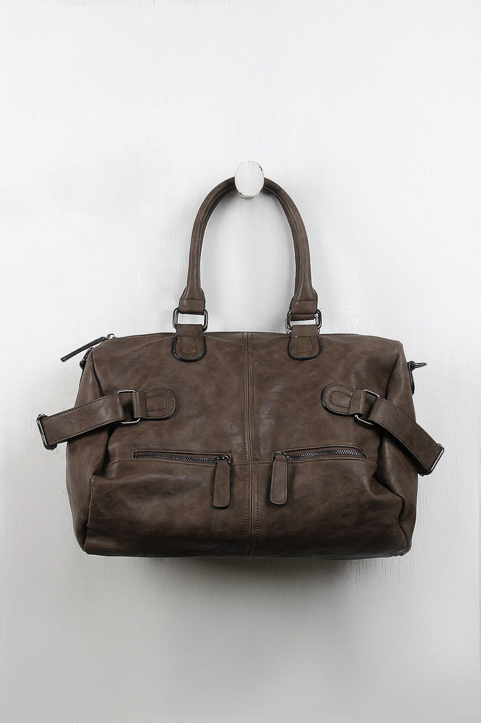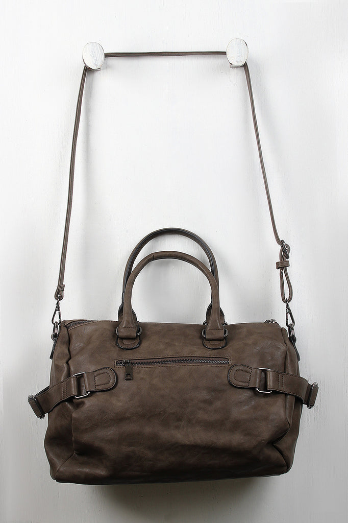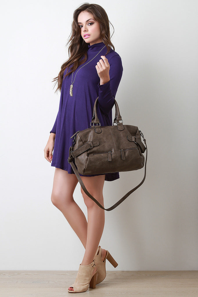 Description This vegan leather bag features two round handles (7" drop), a wide zipper top, and two zipper pockets at the front. Belts on either side of the bag allow you to cinch the bag tighter for a more streamlined look, and a zippered back pocket gives you a secure place to store your wallet that's also easily accessible. The spacious interior has a tribal pattern lining, two slip pockets, and one zipper pocket. Includes adjustable shoulder strap.