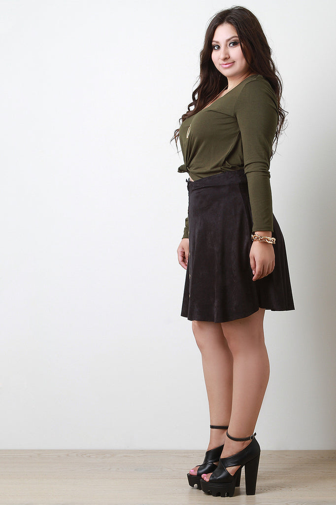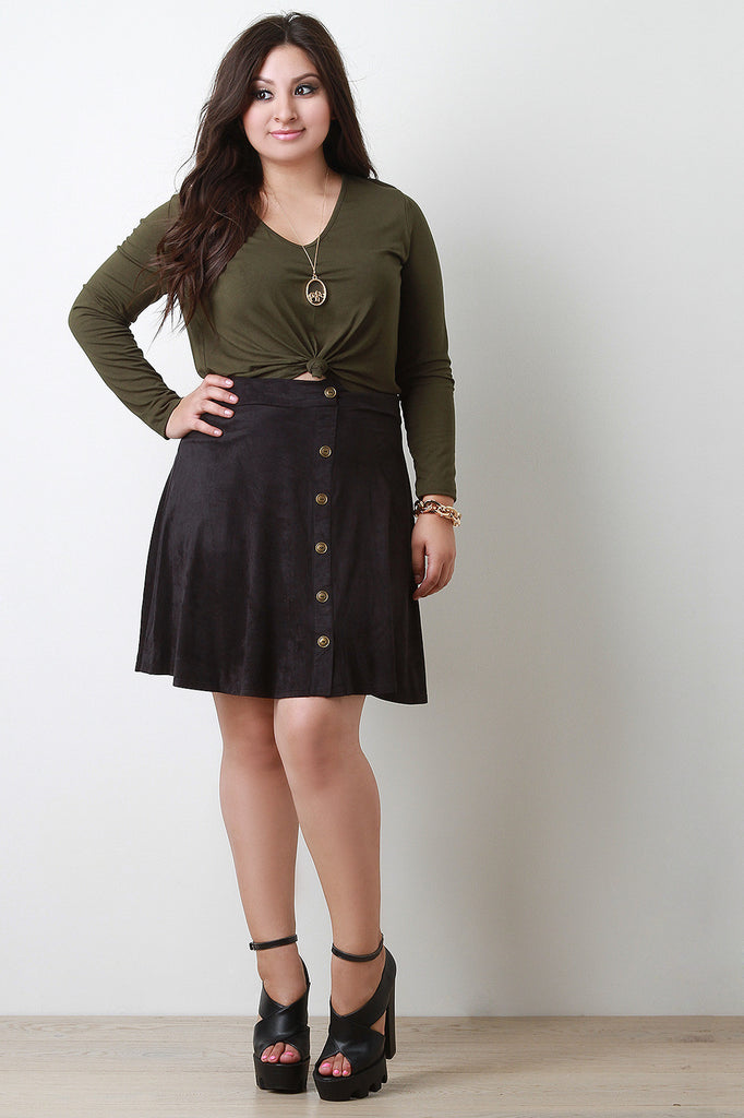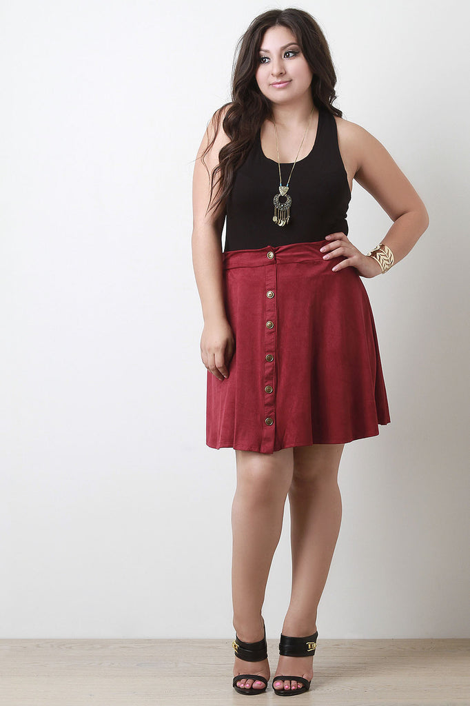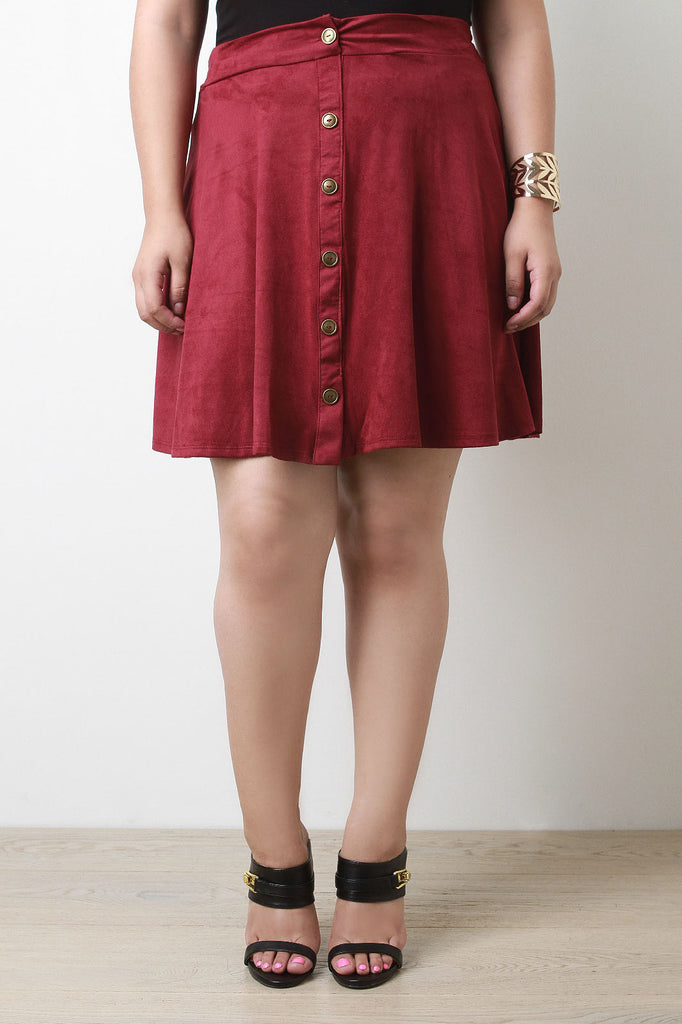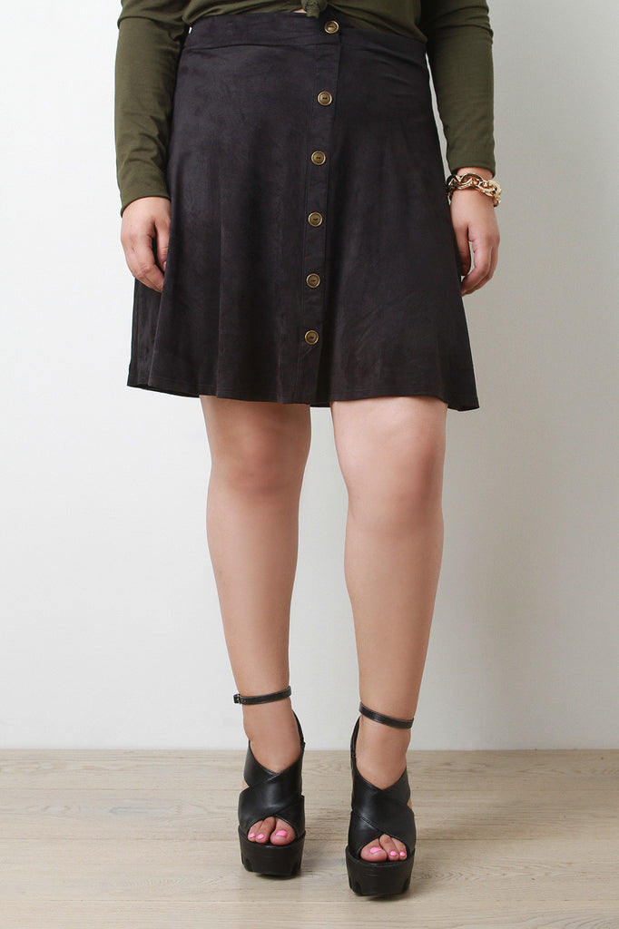 Description A plus size skirt featuring faux suede, A-line shape, and a faux button-down front with bronze-tone buttons. Unlined. Accessories sold separately. 90% Microfiber, 10% Spandex.