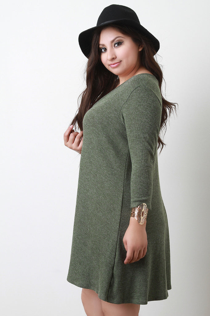 This ribbed knit plus size dress features a v-neckline, long sleeves, and shift cut fit. Accessories sold separately. Made in U.S.A. 83% Polyester, 14% Rayon, 3% Spandex.