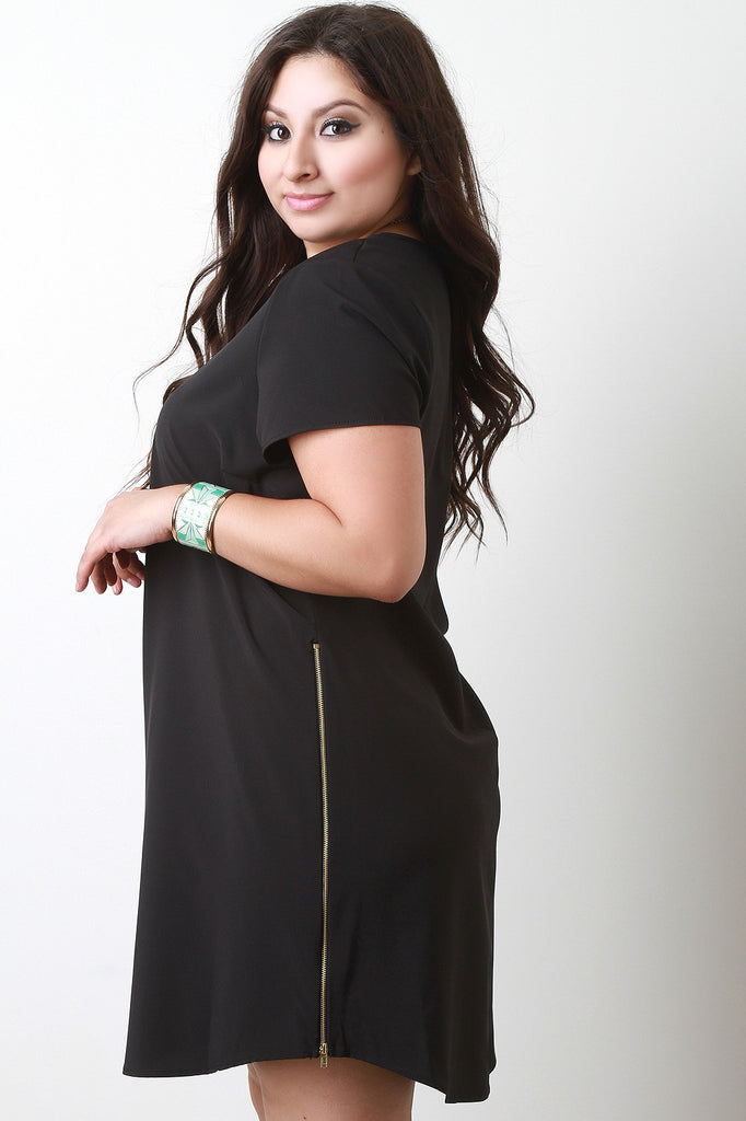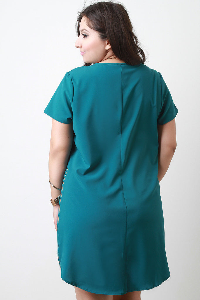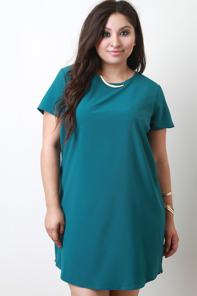 This plus size casual chic dress features a round neckline, short sleeve, shift cut fit, zipper fastener at sides, and a slightly rounded hemline. Accessories sold separately. Made in U.S.A. 96% Polyester, 4% Spandex.