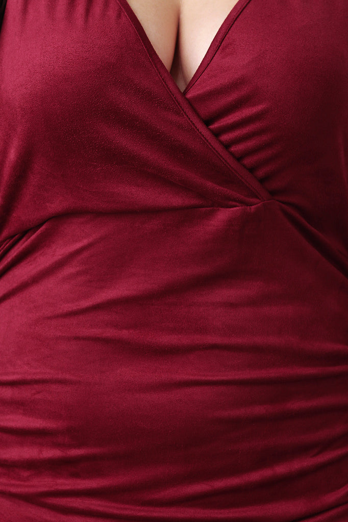 Description This plus size faux suede dress features a surplice v-neckline, long sleeves, and ruched sides. Accessories sold separately. Made in U.S.A. 95% Polyester, 5% Spandex.