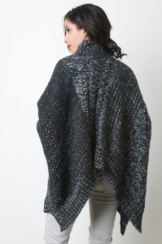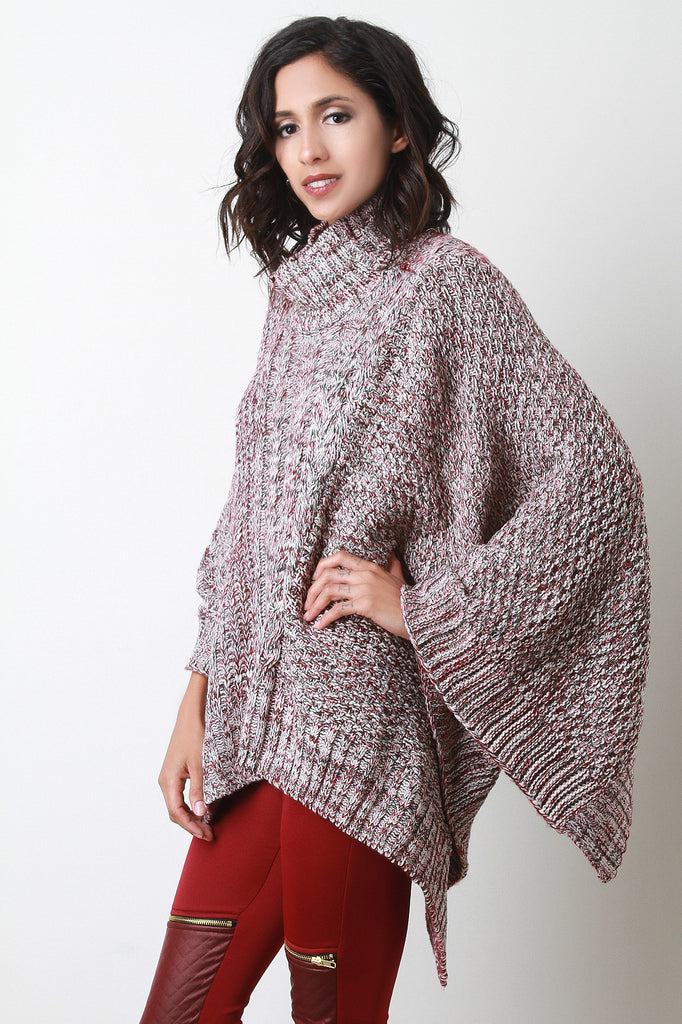 This poncho sweater top features a cable knit accent at center, turtle neckline, and asymmetrical hemline. Accessory sold separately. 80% Acrylic, 20% Wool.