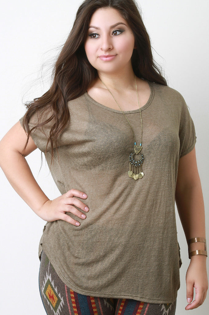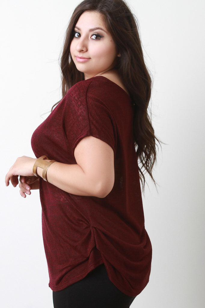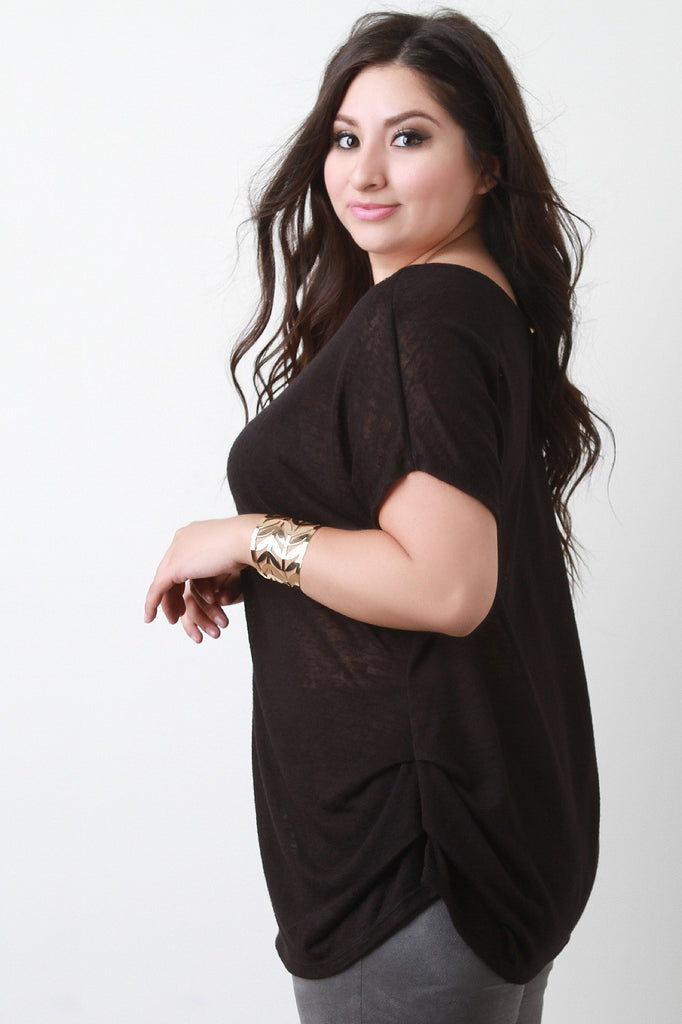 Description This plus size top features a scooped neckline, teardrop cutout design back with single button closure, short dolman sleeves, side cinched details, and curved hemline. Accessories sold separately. Made in U.S.A. 60% Rayon, 40% Spandex.