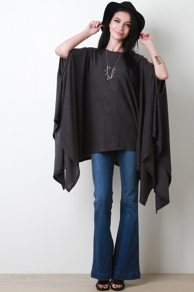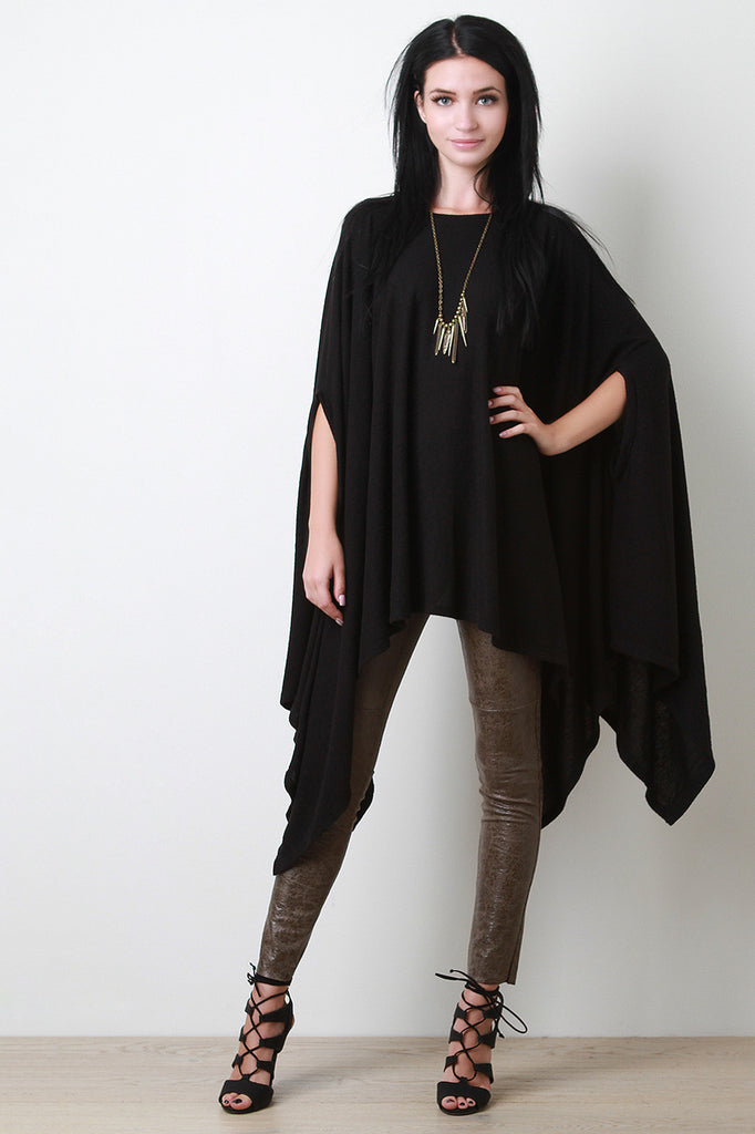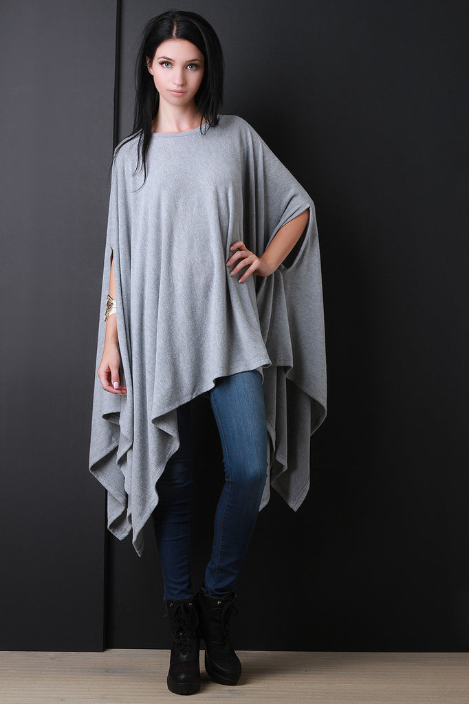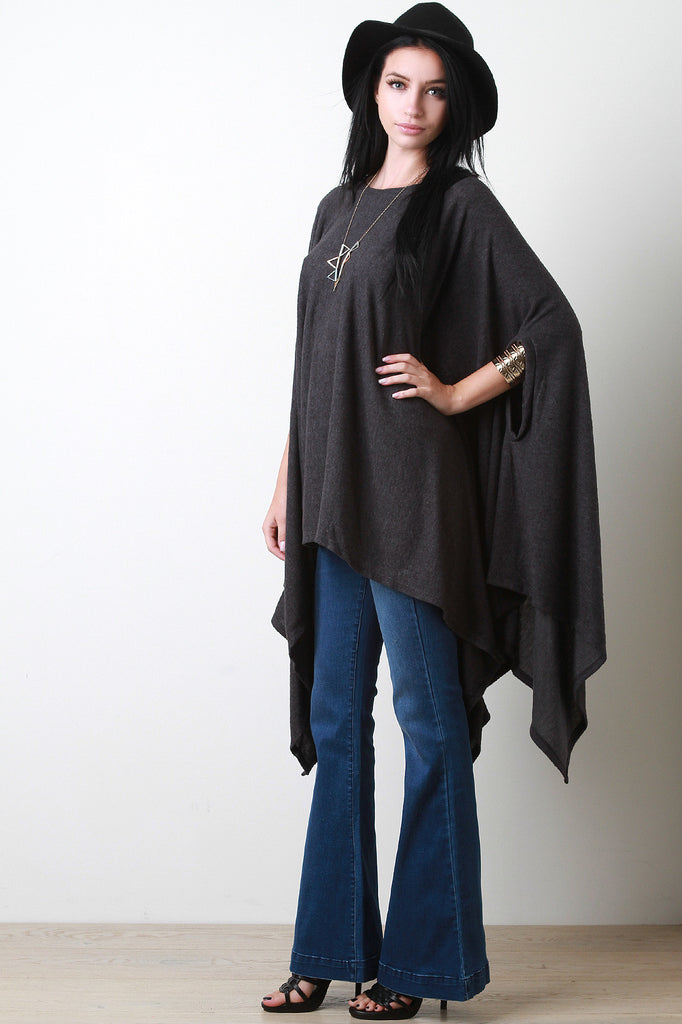 Description A maxi top featuring soft fleecey knit, a round neckline, and arm hole slits. Finished with a draping handkerchief hemline. Accessories sold separately. Made in U.S.A. 67% Polyester, 29% Rayon, 4% Spandex.
