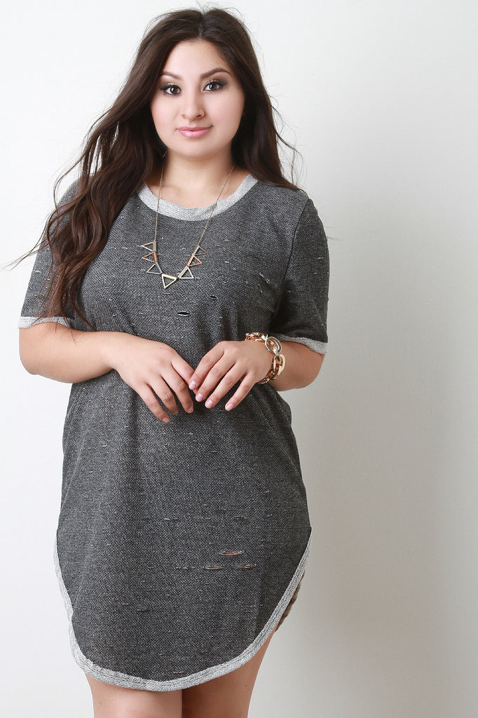 Description A plus size dress featuring distressed French terry, round neckline, short sleeves, and a round hemline with high side slits. Finished with turned up contrast hems. Accessories sold separately. Made in U.S.A. 60% Polyester, 40% Cotton.
