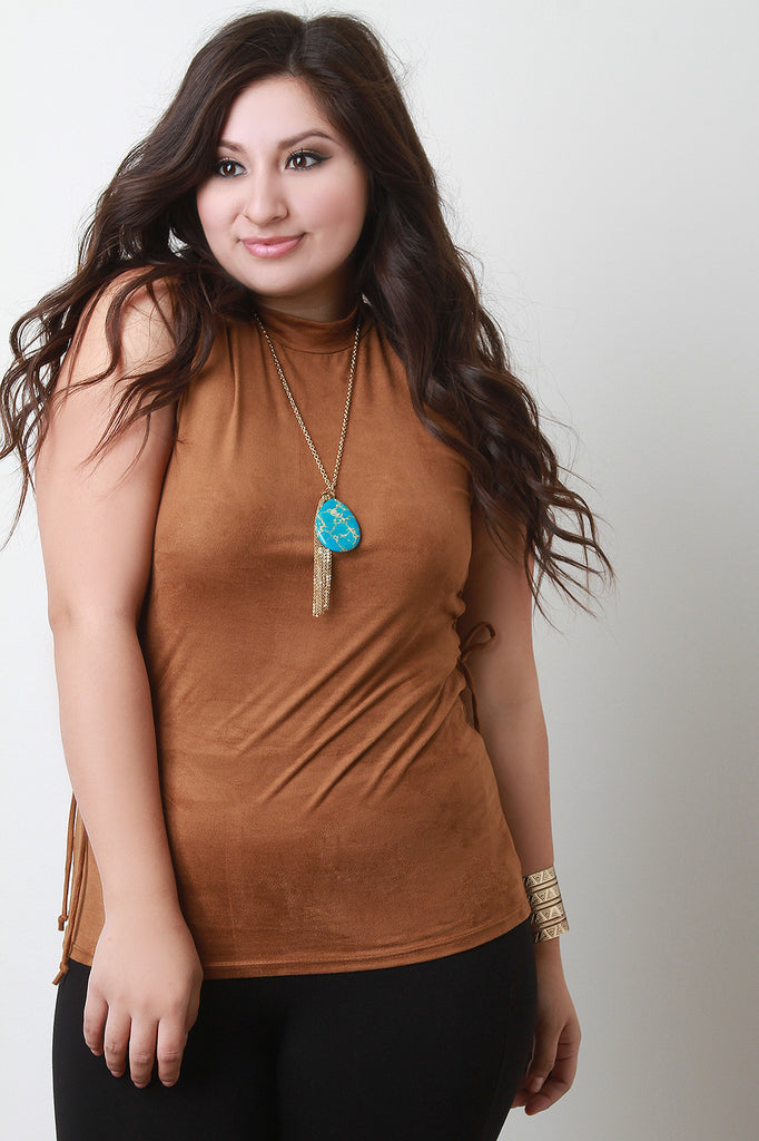 Description This plus size top features a vegan suede fabrication, mock neckline, sleeveless design, corset style lace up detail at sides, and finished with straight hemline. Accessories sold separately. Made in U.S.A. 90% Microfiber, 10% Spandex.