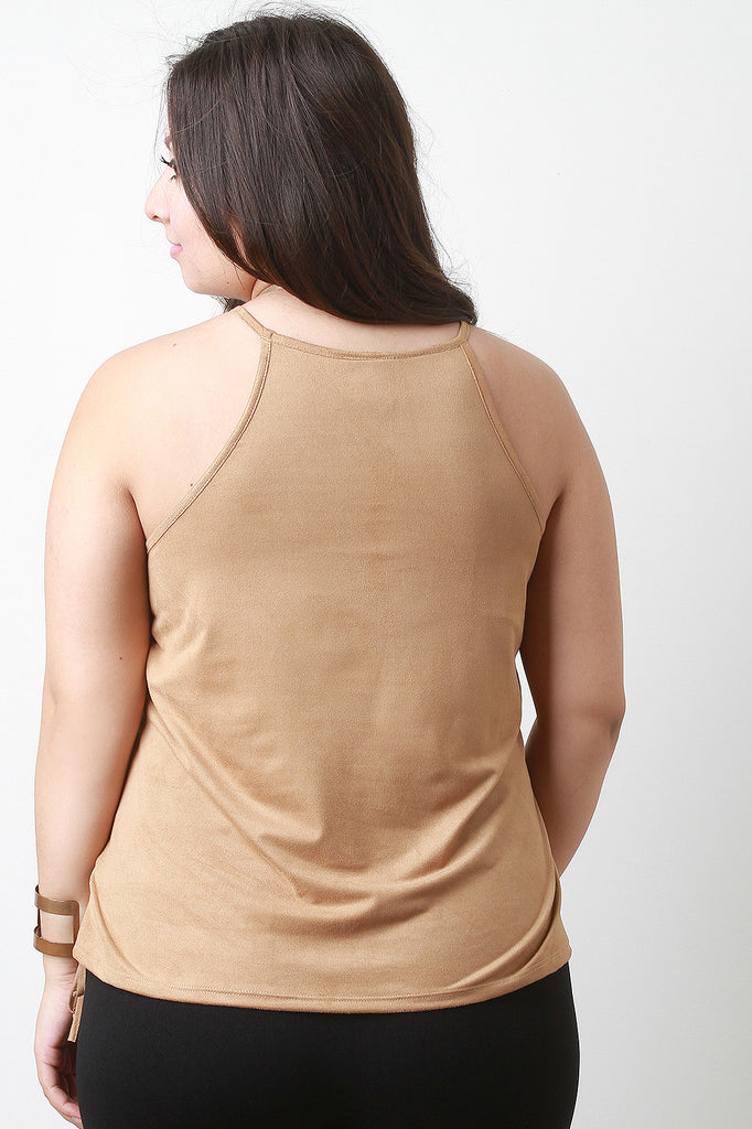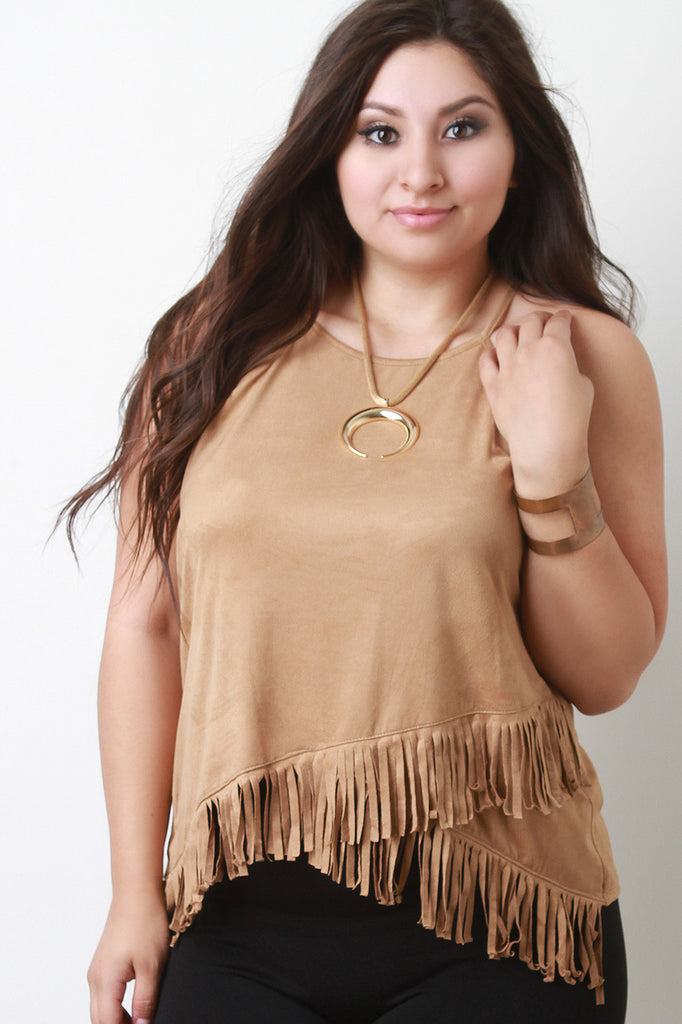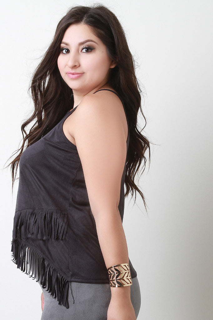 Description This plus size cami crop top features a round neckline, sleeveless design, and finished slanted crisscrossing fringe detail at front. Accessories sold separately. Made in U.S.A. 90% Microfiber, 10% Spandex.