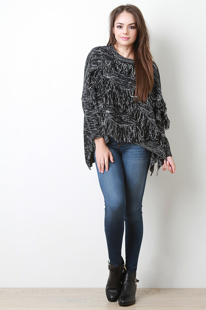 Description This cozy sweater features thick melange knit, round neckline, long sleeves, fringe accents, and finished with high-low hemline. Accessories sold separately. 55% Cotton, 45% Acrylic.