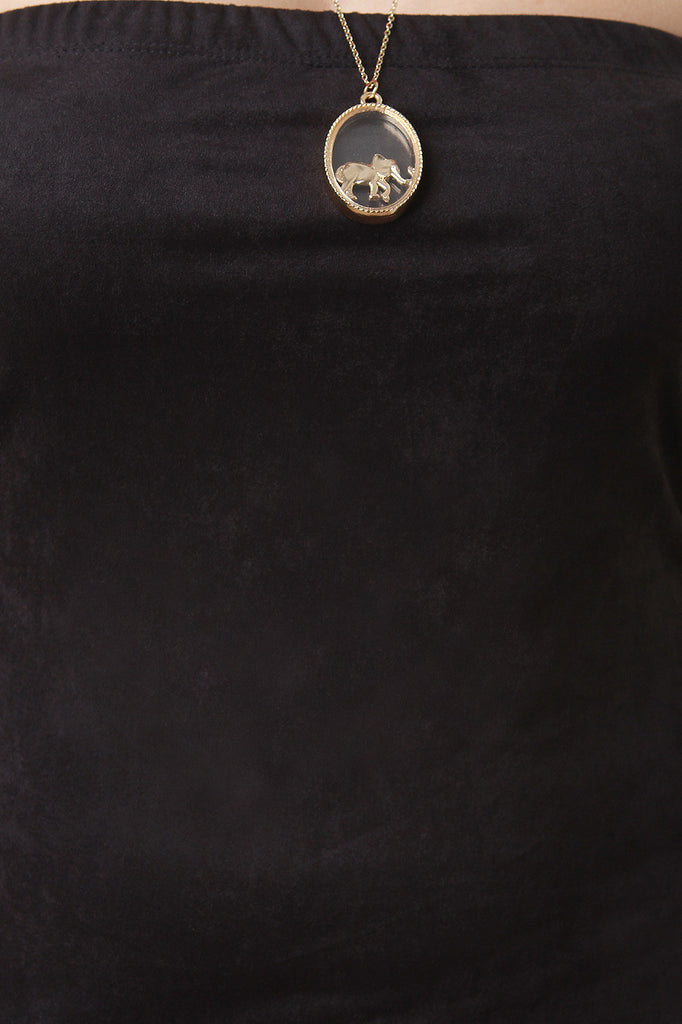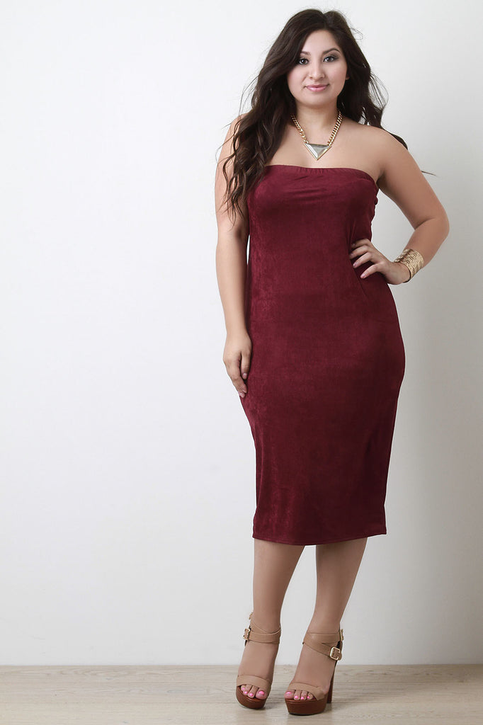 Description This plus size midi dress features a faux suede fabric in a strapless tube design with elasticized bustline. Accessories sold separately. Made in U.S.A. 90% Micro Fiber, 10% Spandex.
