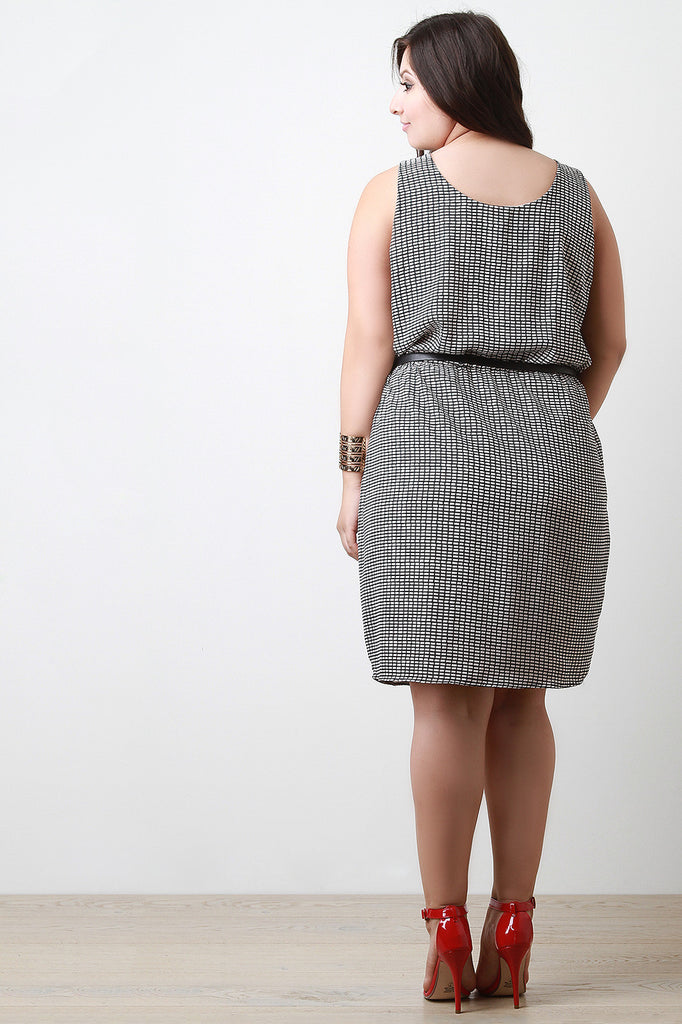 Description This plus size dress features a scoop neckline, sleeveless design, cinched elasticized waist high lighted with a skinny vegan leather belt, side pockets, grid pattern print, and fully lined. Accessories sold separately. Made in U.S.A. 100% Polyester.
