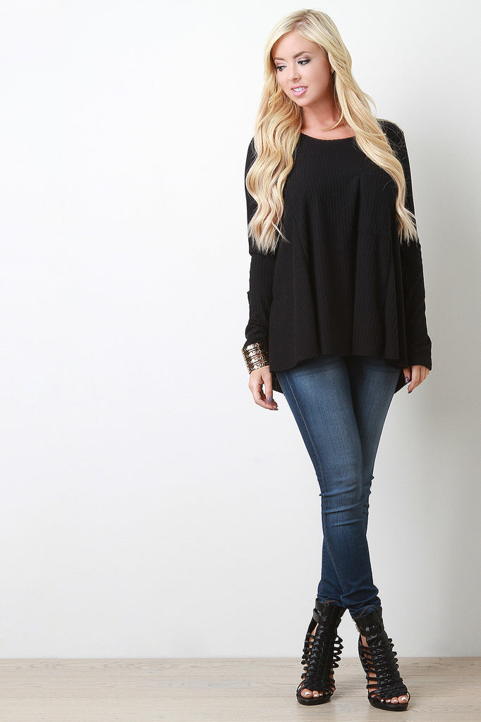 Description This relaxed fit babydoll top features a ribbed knit fabrication, round neckline, long sleeves design, single front pocket, and finished with raw high low hem. Accessories sold separately. Made in U.S.A. 67% Polyester, 30% Rayon, 3% Spandex.