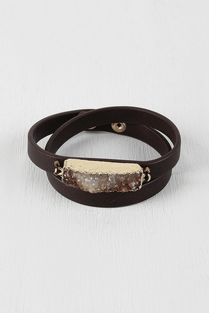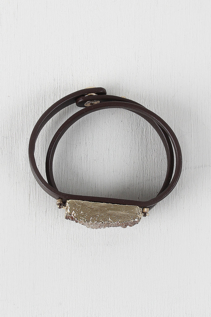 A wrap druzy stone bar centerpiece with gilded sides, and snap button closure that adjusts to two sizes.