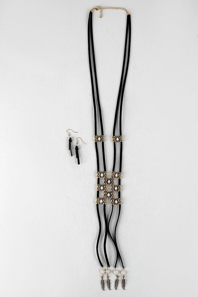 Description This long suede necklace features beads attached with bone-colored diamonds with a flexible pendant connected with multi colored stones and fringe feathers.