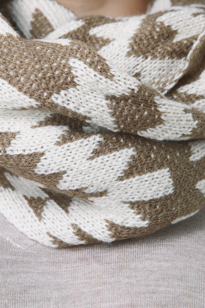 An infinity knit scarf with a two-tone tribal pattern. 100% Acrylic.