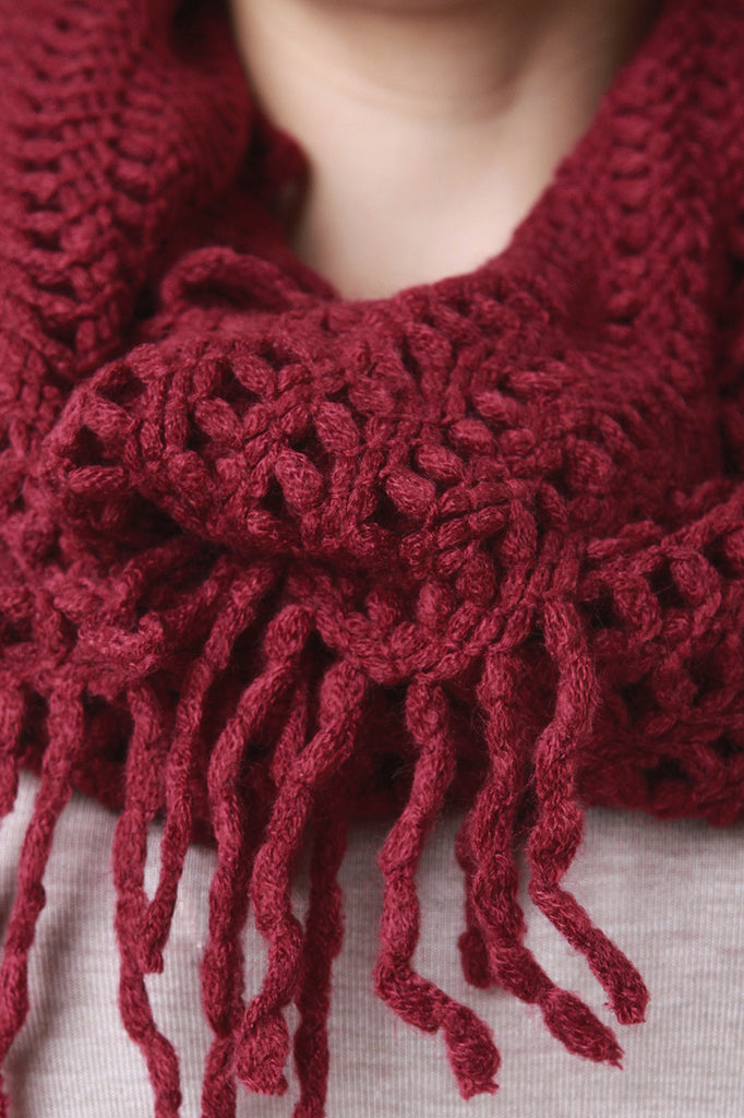 This open knit infinity scarf features solid coloring and fringe edges. 100% Acrylic.