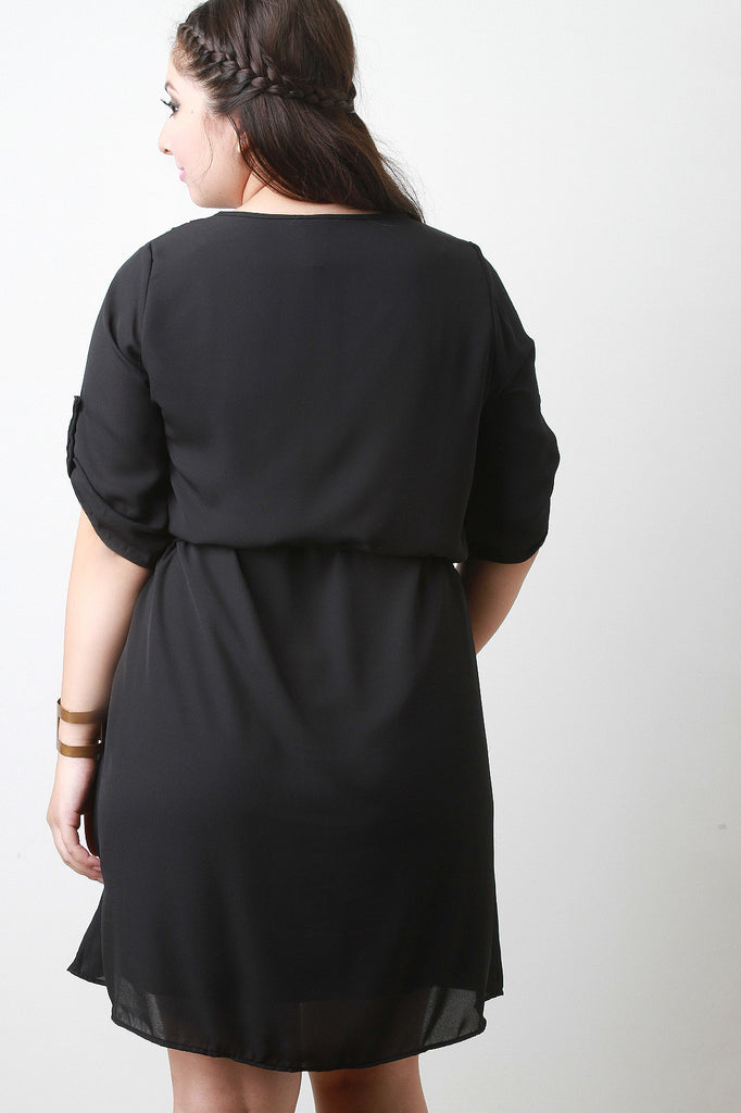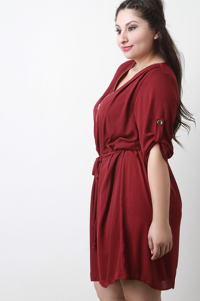 Description A plus size chiffon dress featuring a glossy gold-tone zipper v-neckline, half sleeves with button strap accent, and self-tie sash at waist. Fully lined. Accessories sold separately. 100% Polyester.