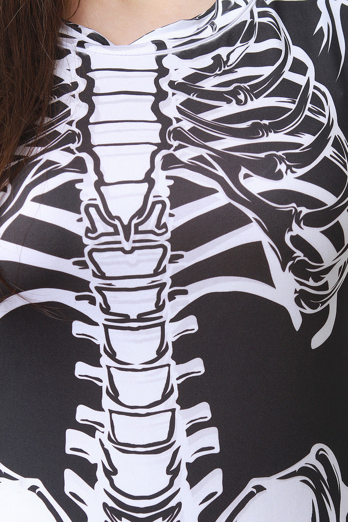 This plus size dress features a skeleton print design, round neckline, short sleeves, and a wide seam rounded hemline. Accessories sold separately. Made in U.S.A. 92% Polyester, 8% Spandex.