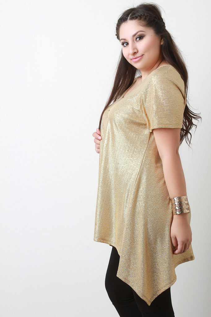 Description This plus size tunic top features a crinkled metallic foil knit fabrication, scooped neckline, short sleeves design, and asymmetrical sharkbite hemline. Accessories sold separately. Made in U.S.A. 97% Polyester, 3% Spandex.