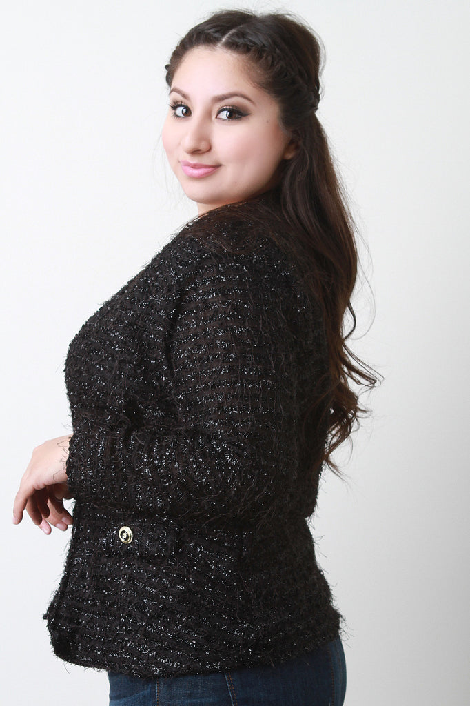 Description This plus size jacket features a shimmery frayed fabrication, collarless design, two faux pockets, long sleeves, and open front construction. Accessories sold separately. Made in U.S.A. 84% Polyester, 14% Lurex, 2% Spandex.