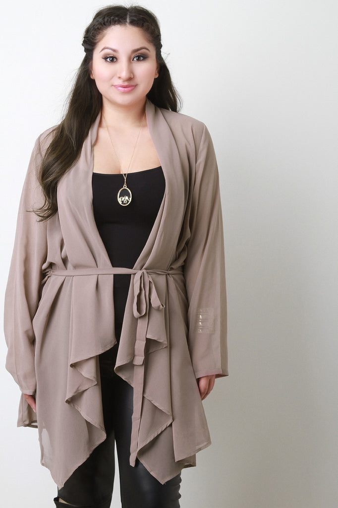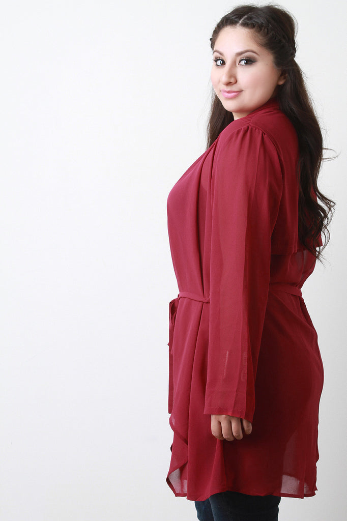 This lightweight plus size cardigan features a semi-sheer chiffon fabrication, shawl neckline, long sleeves, draped open front design with self-tie strap closure, and finished with asymmetrical hemline. Accessories sold separately. 100% Polyester.