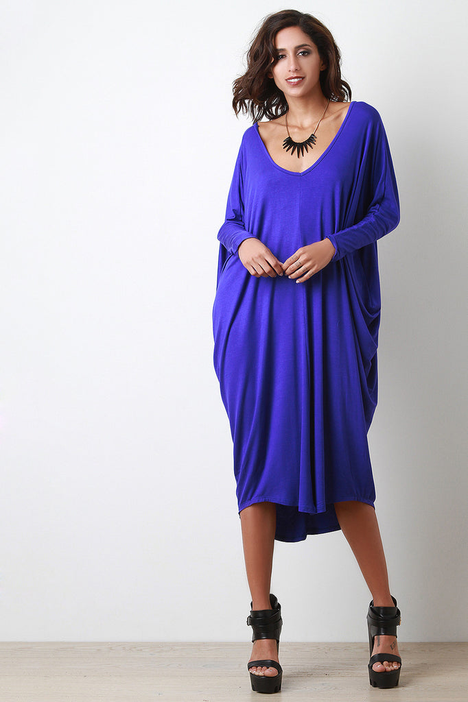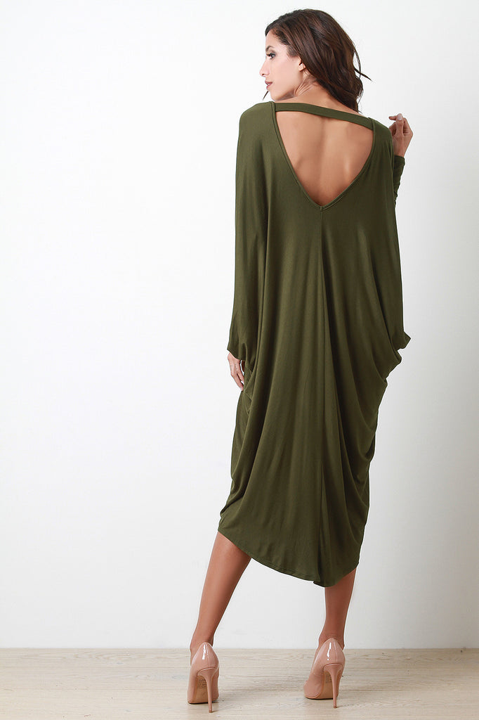Description This loose-fit midi dress features solid color jersey knit, a plunging v-neckline, and long dolman sleeves. Finished with a large keyhole back. Accessories sold separately. Made in U.S.A. 96% Rayon, 4% Spandex.