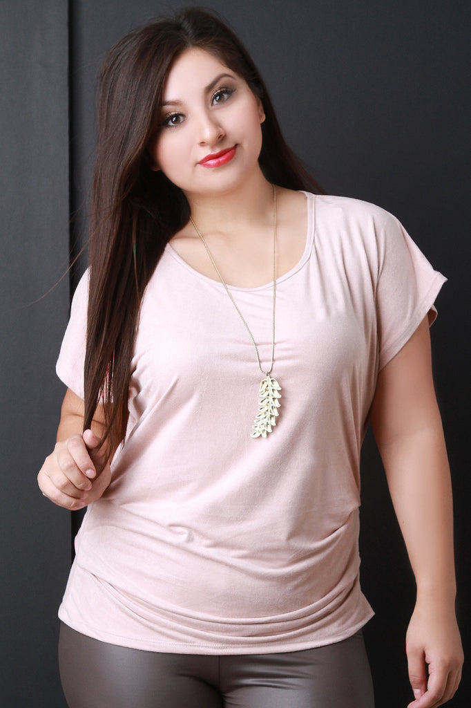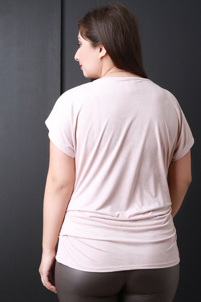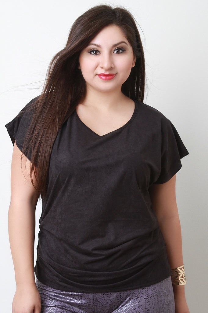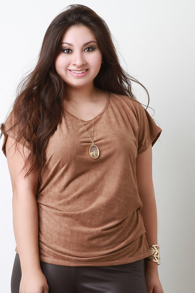 This plus size vegan suede top is short sleeves scooped neckline bodice. Finished with pleated sides. Accessories sold separately. 90% Microfiber. 10% Spandex.
