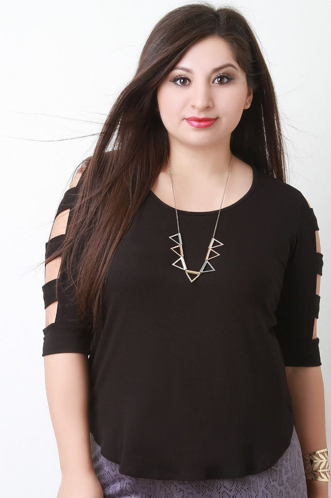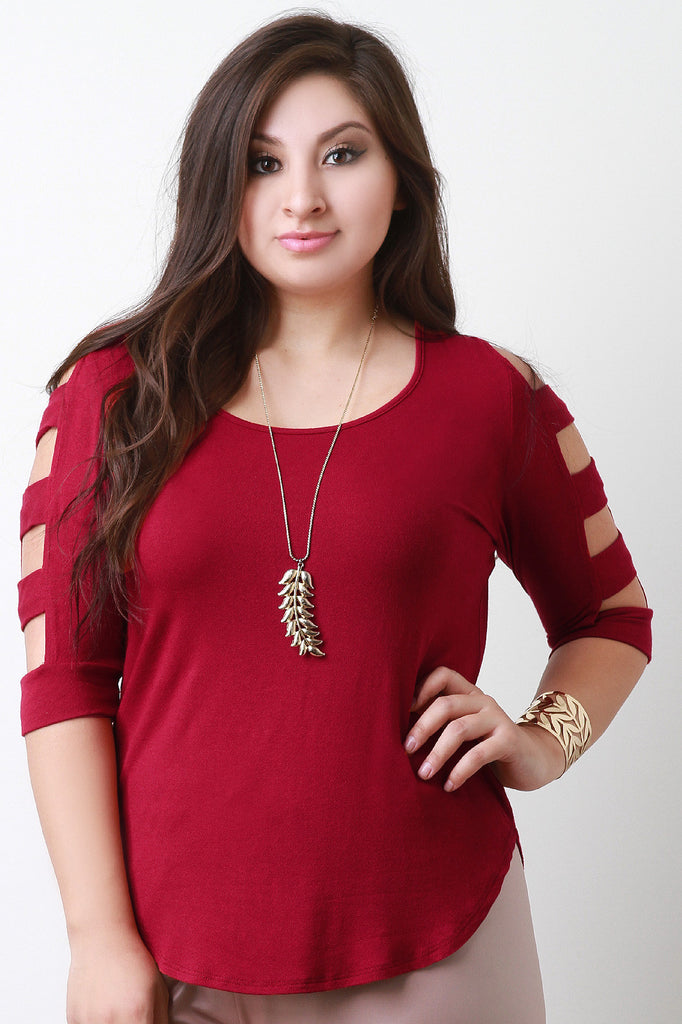 Description This plus size top has quarter sleeves featuring a strappy cutout design. It is scooped neckline with a curved hemline. Stretchy soft knit structure. Accessories sold separately. 97% Viscose. 3% Spandex.