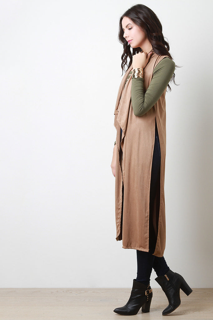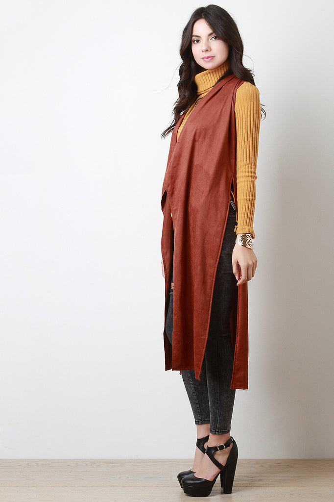 This shawl draping open front with high side slits. It is sleeveless structure. Accessories sold separately. 90% Polyester. 10% Spandex.